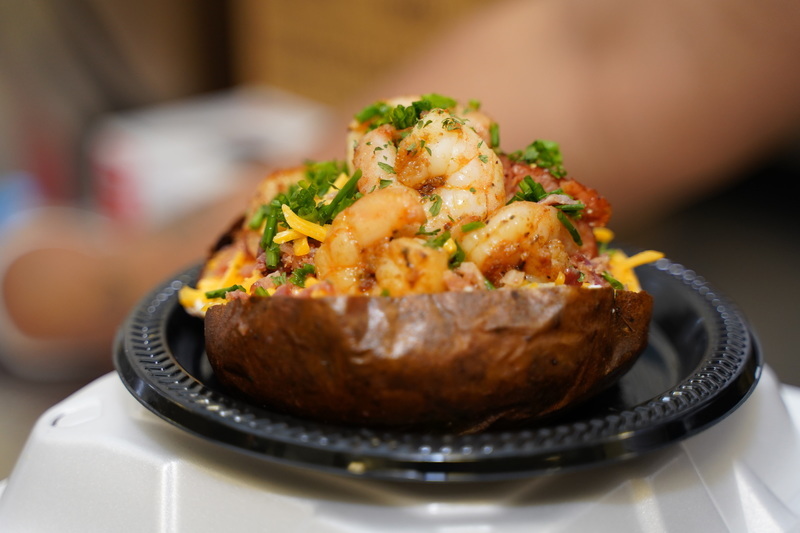 Add the sausage and shrimp inside the potato and garnish the top with the remaining ingredients (cheddar cheese, sour cream, bacon bits, and chives)