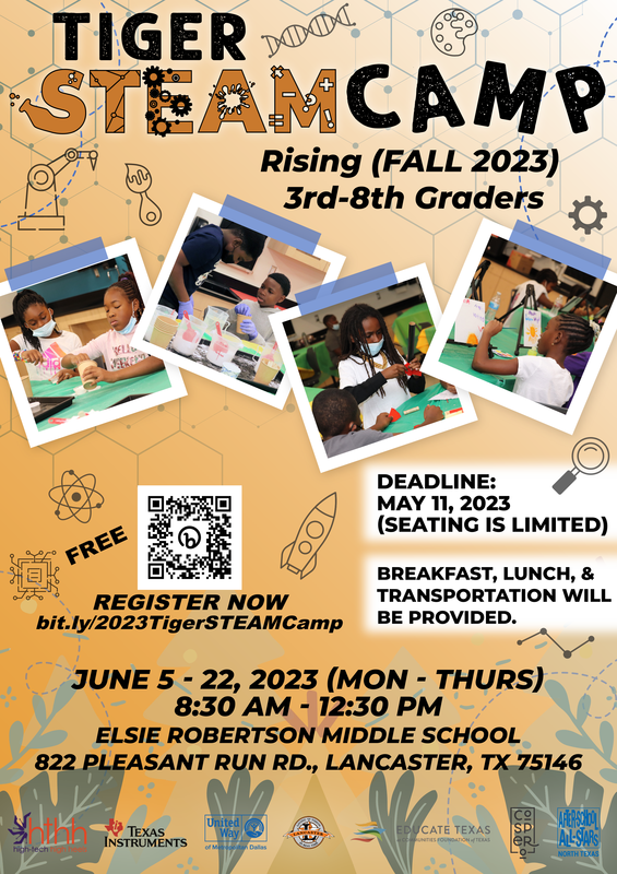 Registration for the Lancaster ISD Summer Tiger STEAM Camp is now officially open for Lancaster ISD rising third through eighth grade students. The camp will run from June 5 through June 22, with sessions held from 8:30 am to 12:30 pm.