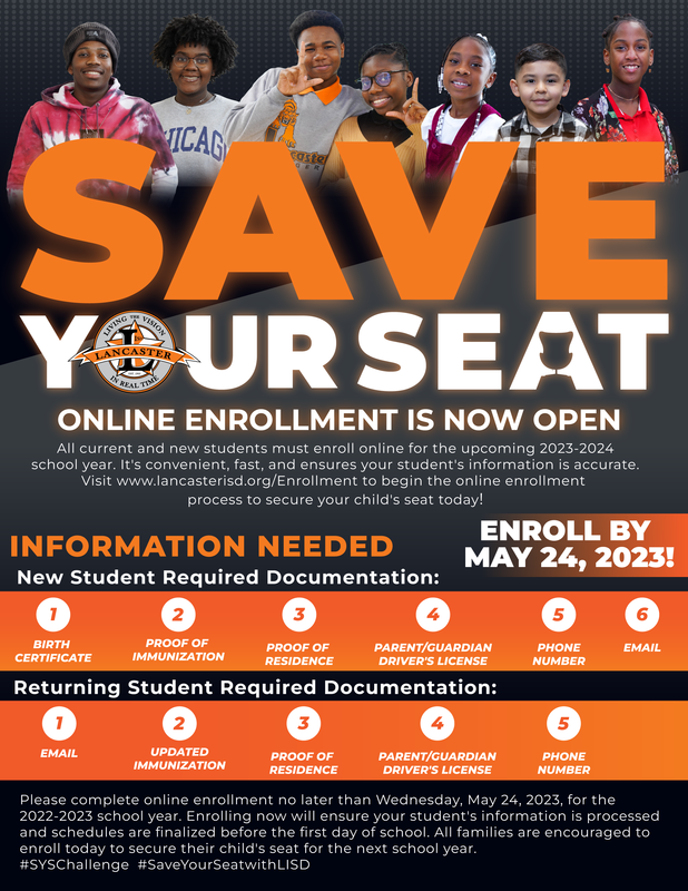 To begin online enrollment, returning and new-to-district families must visit www.lancasterisd.org/enrollment and follow the easy steps to complete the process. A complete list of all documentation needed can be found on the enrollment page.