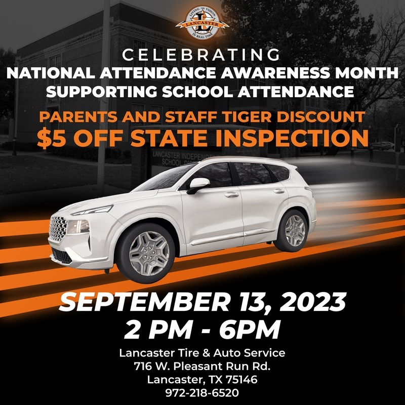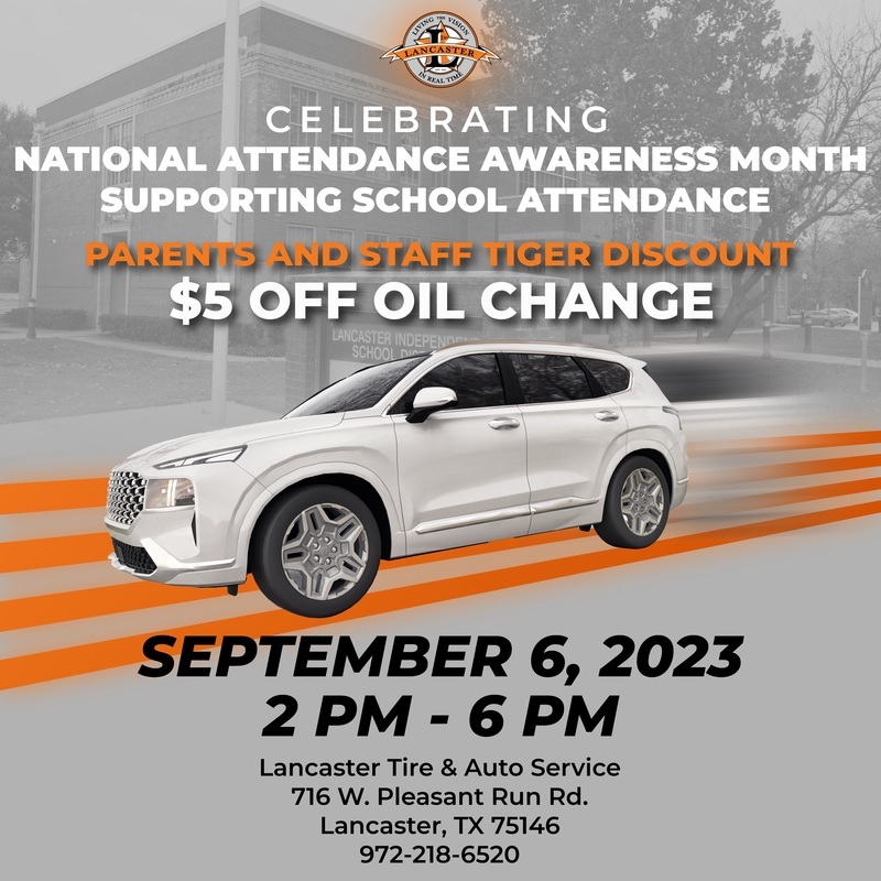As National Attendance Awareness Month gets underway, Lancaster ISD has partnered with Lancaster Tire & Auto Service (716 W. Pleasant Run Rd.) to offer service discounts for your vehicle. We want to ensure your car is running well so you can continue getting your students (or yourself) to school on time.