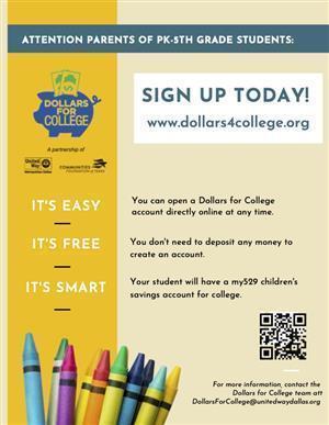 Lancaster ISD is proud to partner with United Way for the Dollars for College Program. Dollars for College is a children’s savings account program that helps you save money for your child’s future college or vocational training expenses after high school.