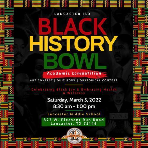 The Black History bowl is Saturday, March 5, 2022, from 8:30 a.m. - 1 p.m. at Lancaster Middle School.