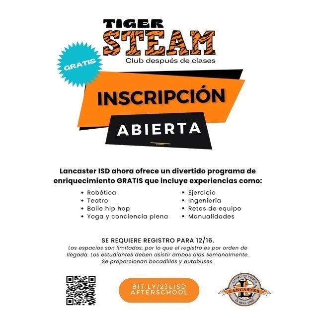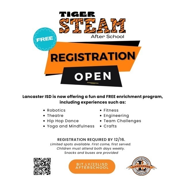 Please contact Faith Milika, Lancaster ISD Elementary Science & STEAM Enrichment Coordinator, faithmilika@lancasterisd.org, for more information.