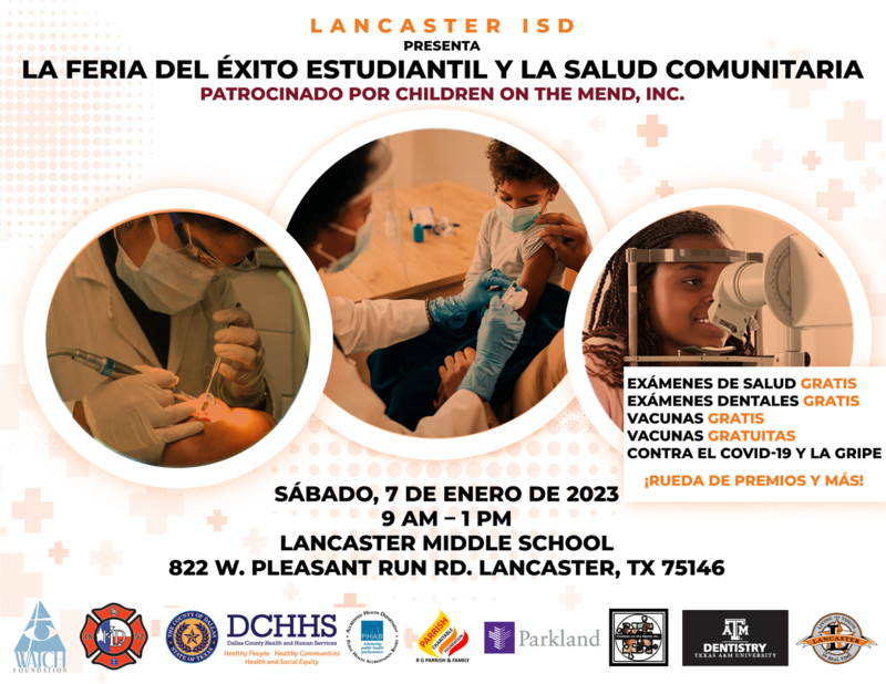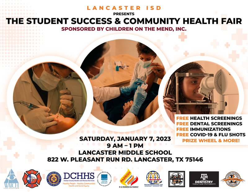 Lancaster ISD Student Services is hosting a student success and community health fair sponsored by Children on the Mend, Inc. Join us for the free health fair on Saturday, January 7, 2023, at Lancaster Middle School, for free health screenings, free dental screenings, free COVID-19 and flu shots, and much more. Anyone who receives a COVID-19 vaccine during the health fair will receive a $25 gift certificate. In addition, if your student needs to obtain their required immunizations to return to school, this is the perfect opportunity.