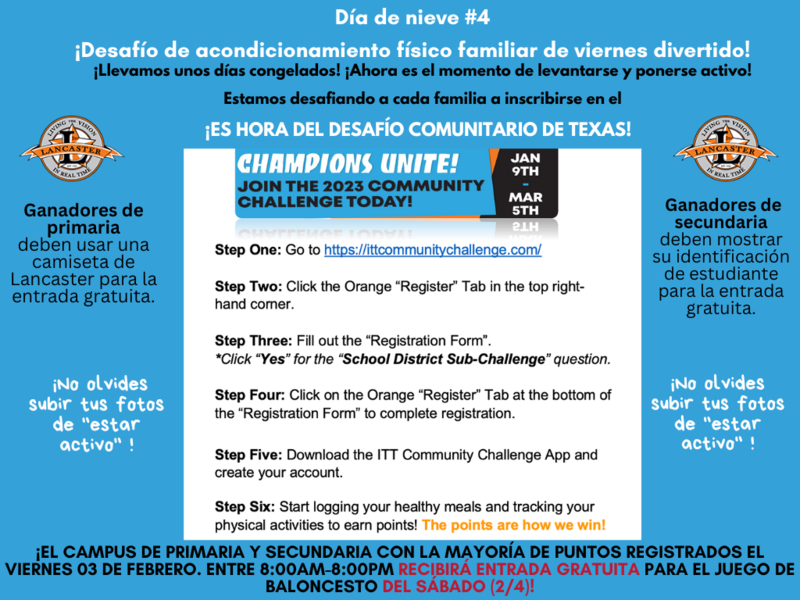 We want our students and parents to register for the Community Challenge today to help Lancaster ISD stay healthy and win big. Every healthy point counts – including YOURS! The elementary and secondary campuses with the most logged post today will gain free entry into Lancaster High School basketball games at the LHS Coliseum on Saturday, February 4, at 2 pm (girls) and 4 pm (boys). When registering, don't forget to follow each step and log your points each day until March 5!